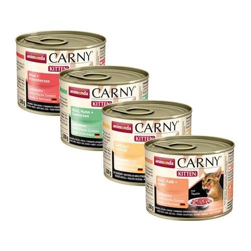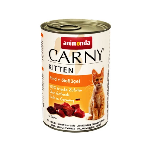 - Animonda Carny Kitten – Rund met Gevogelte: 39% rundvlees (long, hart, vlees, nier, uier), 14% kippenlever, 6% kalkoenhart, 6% eendenhart en calciumcarbonaat.