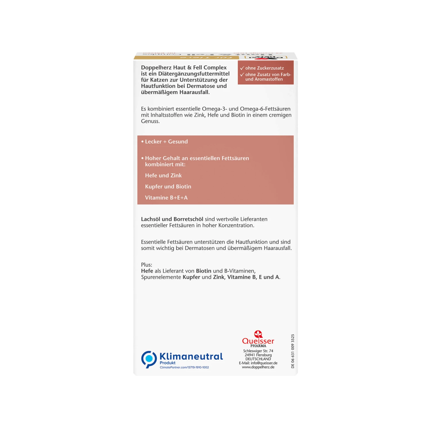Doppelherz Huid & Vacht Complex voor Katten zijn lekkere romige licks die de huidfunctie van jouw kat ondersteunen bij huidaandoeningen. U kunt het ook geven bij overmatig haaruitval. Het combineert waardevolle omega-3- en omega-6-vetzuren met biotine, biergist, koper, zink en vitamine B, E en A. De belangrijke omega-3-vetzuren EPA en DHA zijn essentiële voedingsstoffen voor een gezonde huid en een glanzende vacht.
