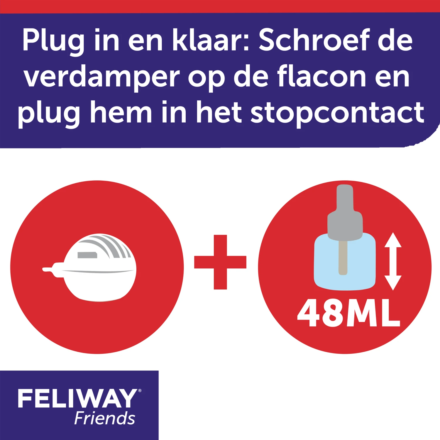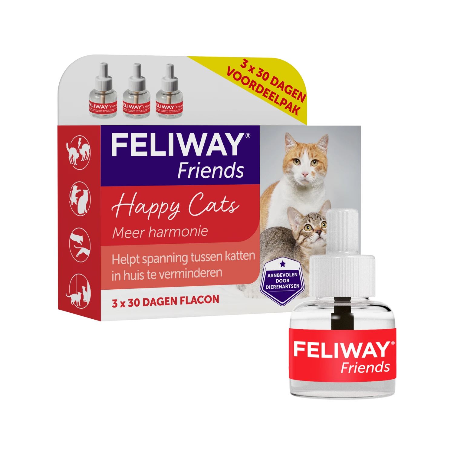 De verdamper verspreidt een geurloos feromoon, het zogenaamde Cat Appeasing Feromoon. Dit feromoon wordt door de moederpoes afgegeven om haar kittens een veilig gevoel te geven; het zorgt er tevens voor dat zij zich sterk aan elkaar hechten. Op deze wijze draagt Feliway Friends bij aan de vermindering van spanningen en kunnen uw katten beter met elkaar omgaan. De starterskit wordt geleverd met een verdamper en navulling. De navulling is ook los verkrijgbaar. Wanneer u merkt dat uw kat ook andere gedragsproblemen vertoont, zoals in huis plassen, angst en krabben, wordt aangeraden Feliway Friends gelijktijdig te gebruiken in combinatie met Feliway Classic.